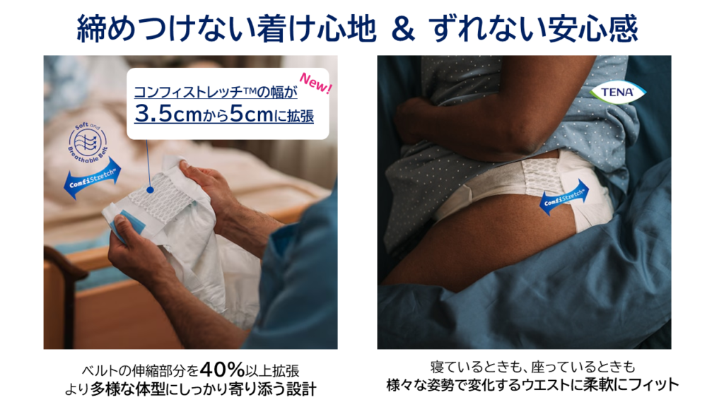 このたび、さらに進化したTENAフレックスは、ベルトの付け根の伸縮素材である「コンフィストレッチTM」が約40%拡張。
